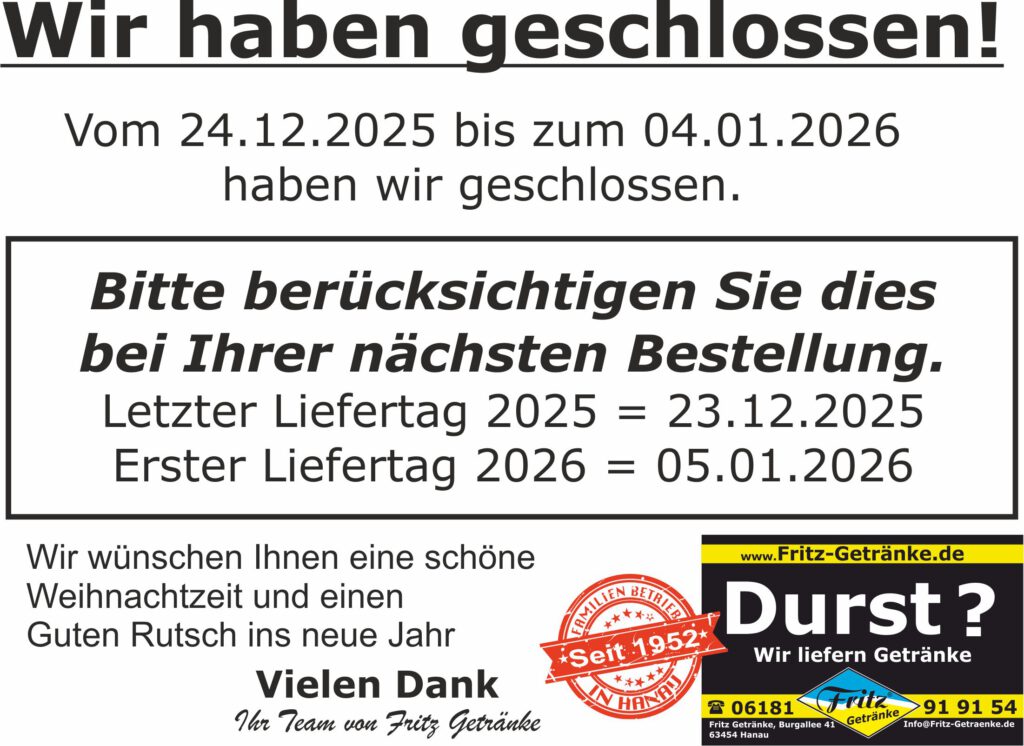 Willkommen bei Fritz GetränkeIhr Getränkemarkt und Lieferpartner aus Hanau-Kesselstadt.Seit über 20 Jahren stehen wir für zuverlässigen Service,eine große Produktauswahl undindividuelle Lösungen für Firmen und Privathaushalte.